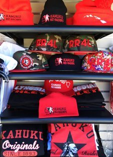 • Any RR4L — “Red Raiders 4 Life” — fans of Kahuku High sports and other area of excellence out there? Kahuku.org has set up a remote kiosk at the new Marketplace to make it easier to buy Kahuku High tee shirts, shorts, auto license plate frames, hats, bags, umbrellas and even kiddie-wear. Become a fan, too. Go Red Raiders!