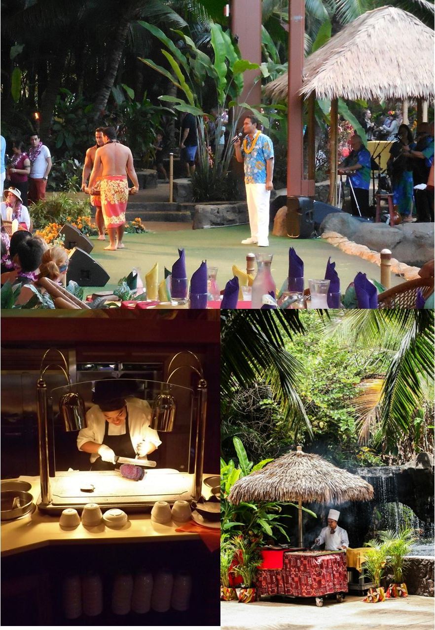 - Most visitors choose the amazing Ali’i Luau with freshly cooked pua’a (pig) cooked all day in an authentic imu (underground oven) and numerous Polynesian, American and Asian selections in a covered outdoor setting with waterfalls, lagoons, and gorgeous tropical flowers. The fact that it also includes entertainment with live music and dance makes the experience truly magical.
