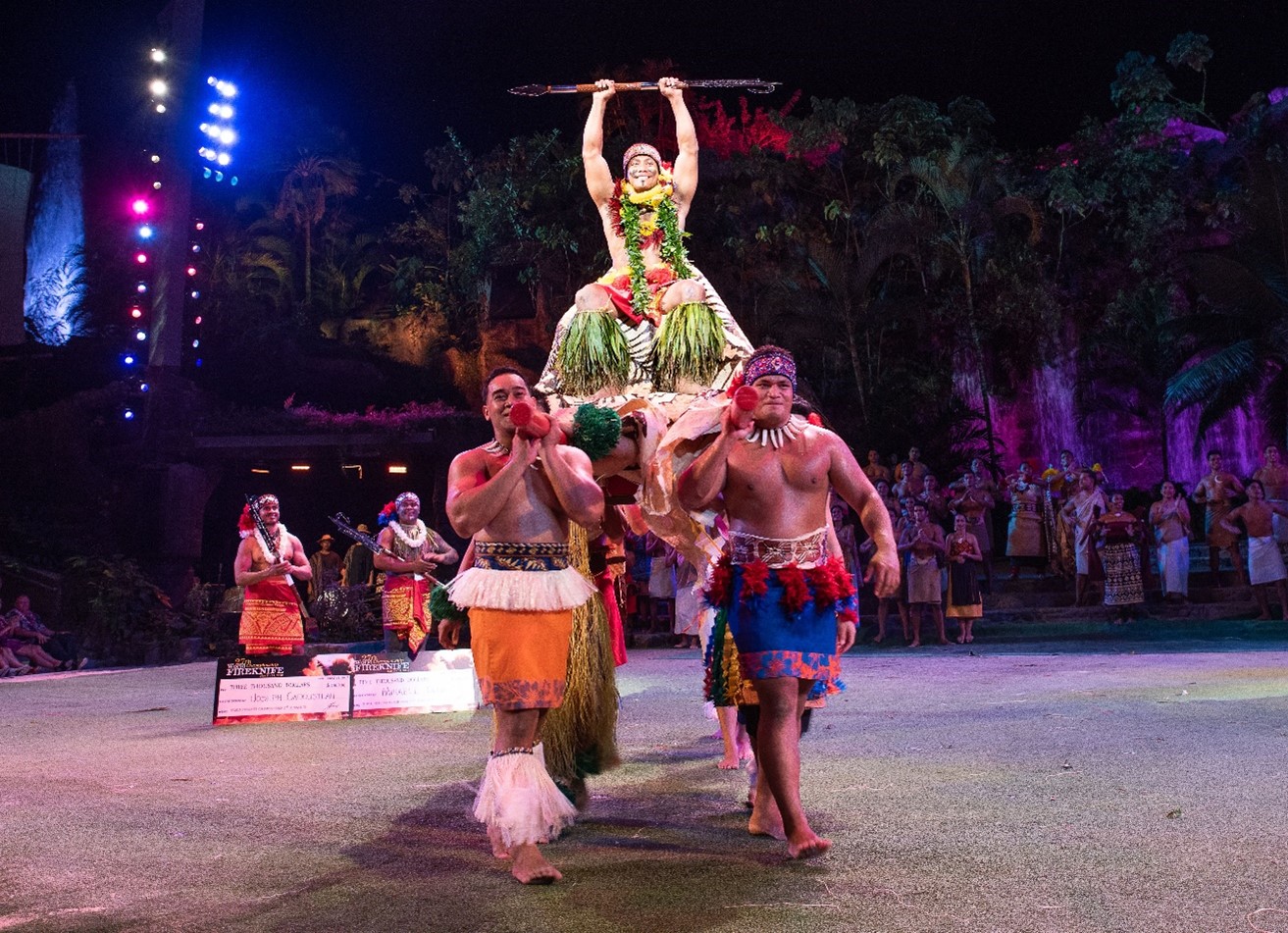 Falaniko Penesa, World Champion of the 2019 World Fireknife Championship, is lifted by his fellow dancers in celebration.