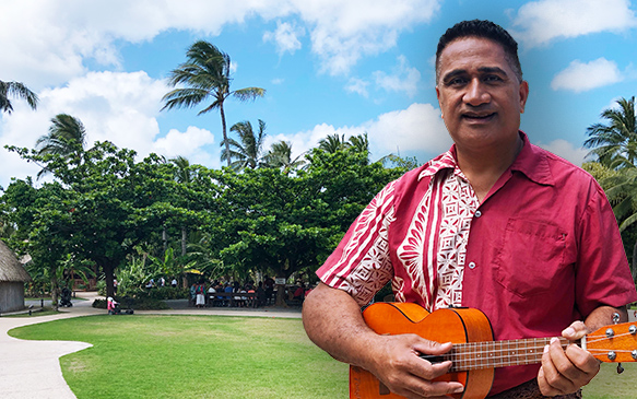 Semisi Fakatava, assistant manager of the Polynesian Cultural Center’s Tongan Village, with a telie or almond tree in the background.